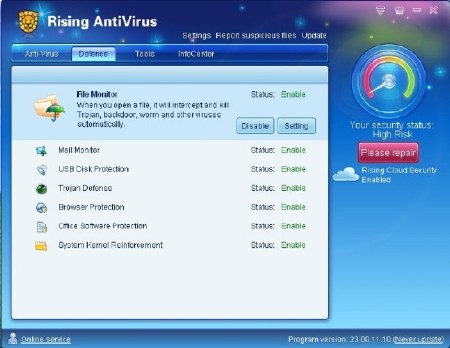 Free Rising Antivirus 2011 обеспечивает защиту компьютера от всех видов вирусов, троянов, сетевых червей, руткитов (Rootkits) и других вредного программного обеспечения. Легкость в использовании, технология активной защиты Active Defense, технологии Patented Unknown Virus Scan, Clean technology и Patented Smartupdate technology делают бесплатный антивирус Rising приложением по принципу "установил и забыл", что позволяет сконцентрироваться Вам только на своих делах.